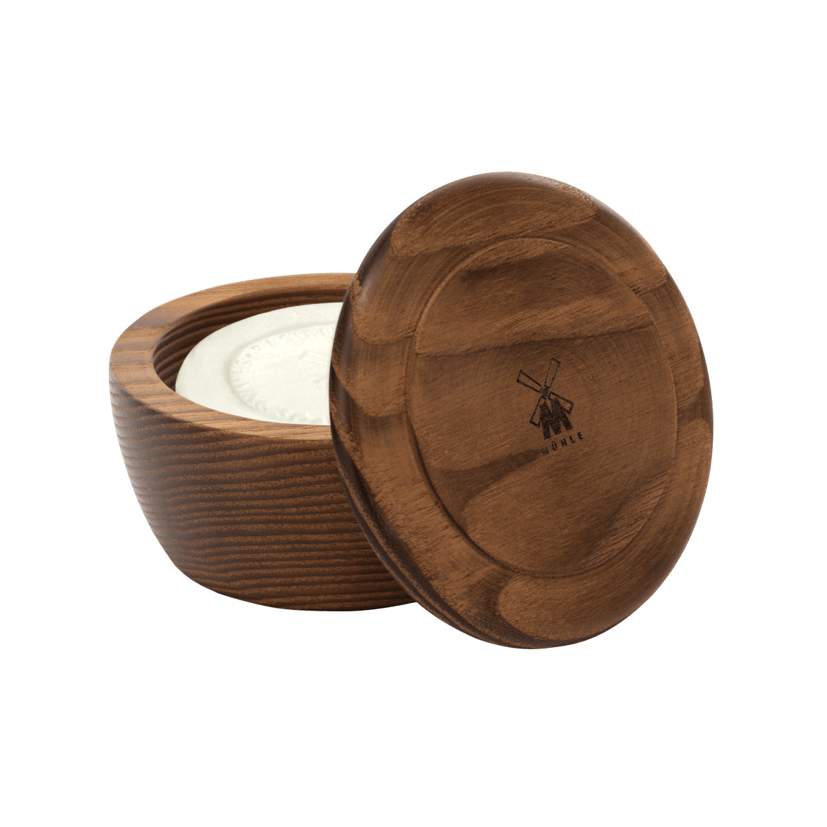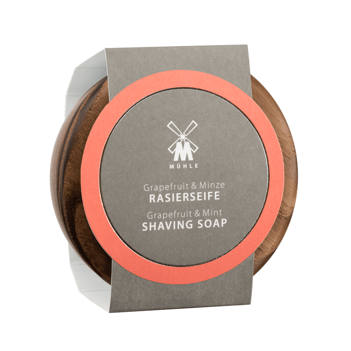 Raktvål från tyska Mühle i elegant träskål i värmebehandlat askträ. Raktvålen arbetas tillsammans med en rakborste upp till ett fyllig lödder som när det appliceras på huden gör att rakhyveln glider lätt och orsakar minimal irritation. Mühles raktvålar är tillverkade enligt ett komplicerat recept och förbereder huden och skägget på särskilt noggrann och mild rakning. Tvålen har en uppfriskande doft av grapefrukt, mint och med toner av svartpeppar, cedeträ, amber och vetiver. Mintoljan ger en uppfräschande och kylande effekt på huden.